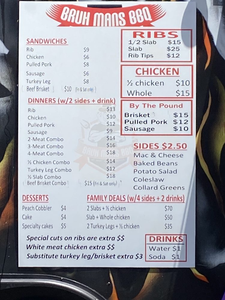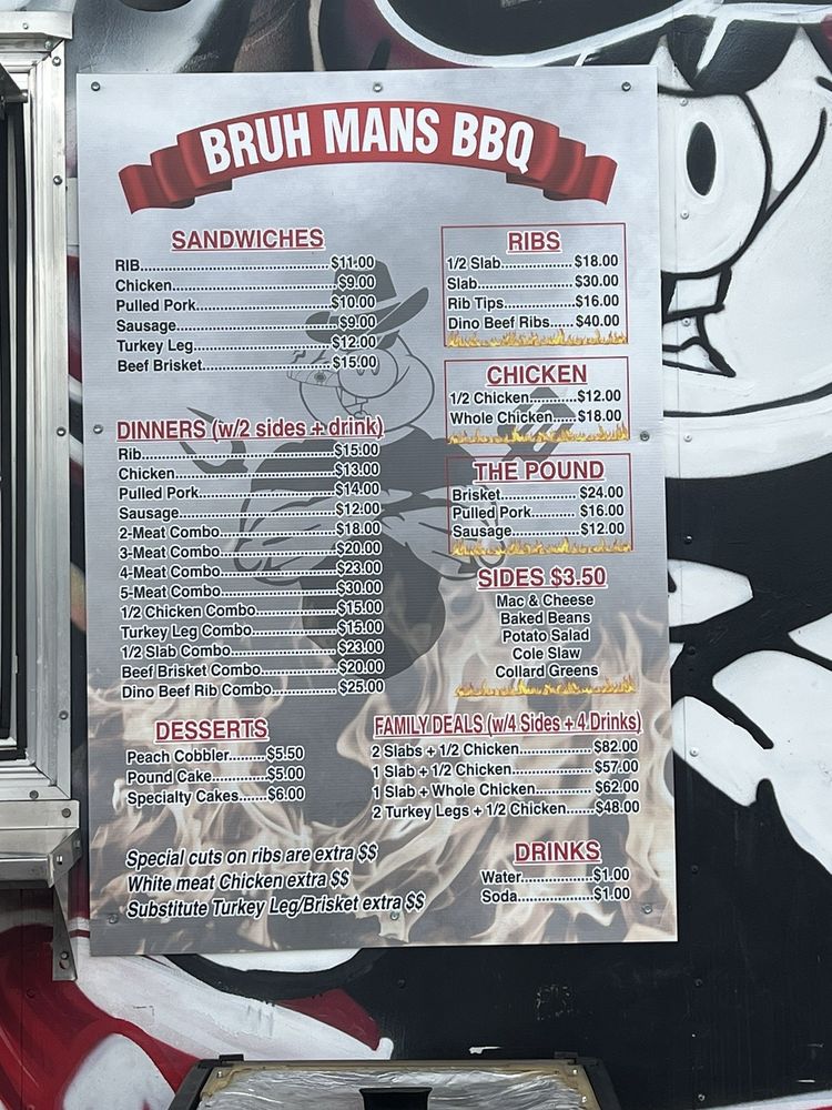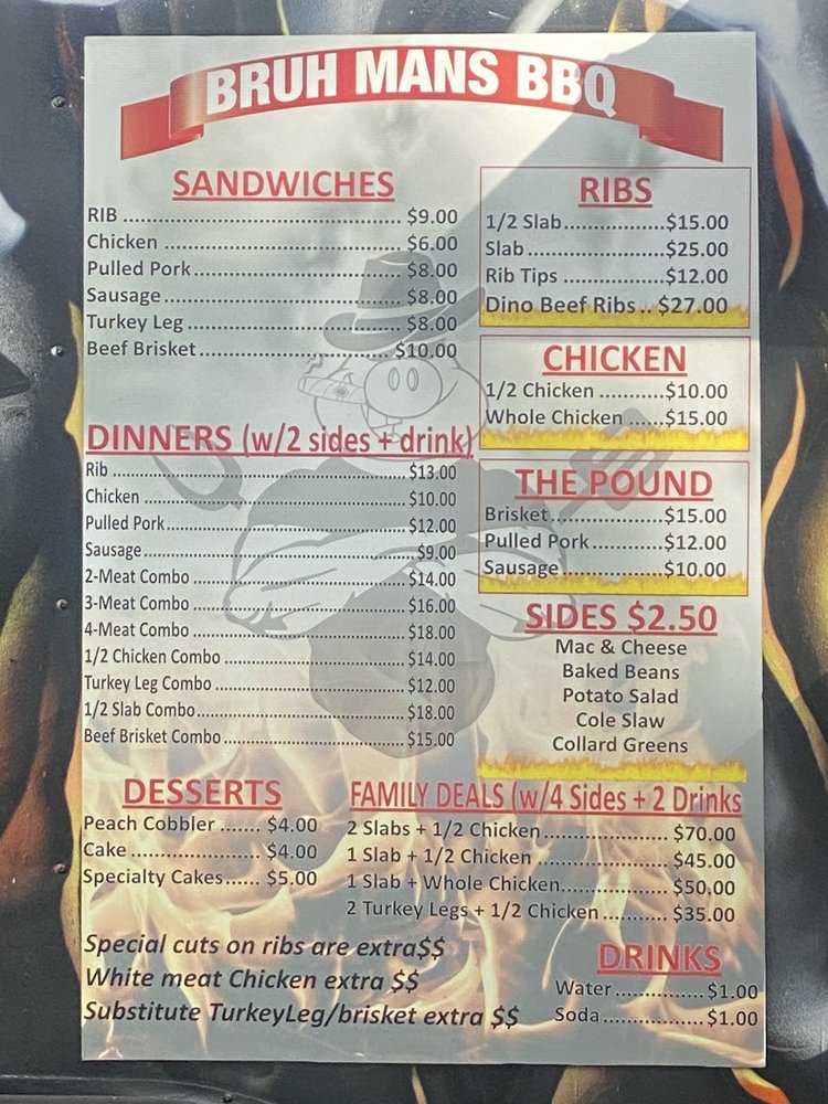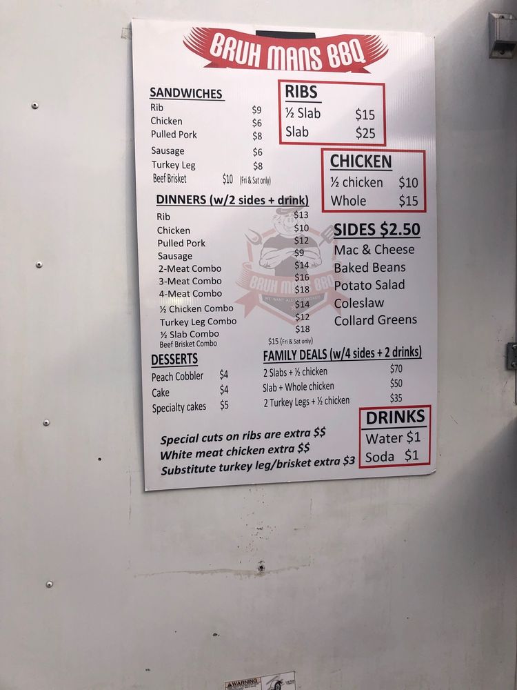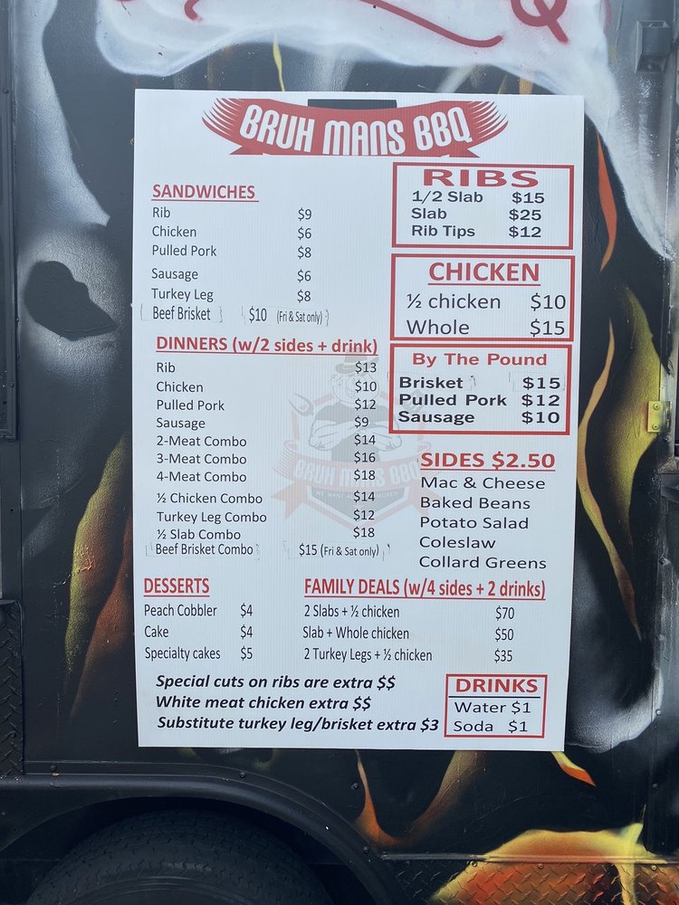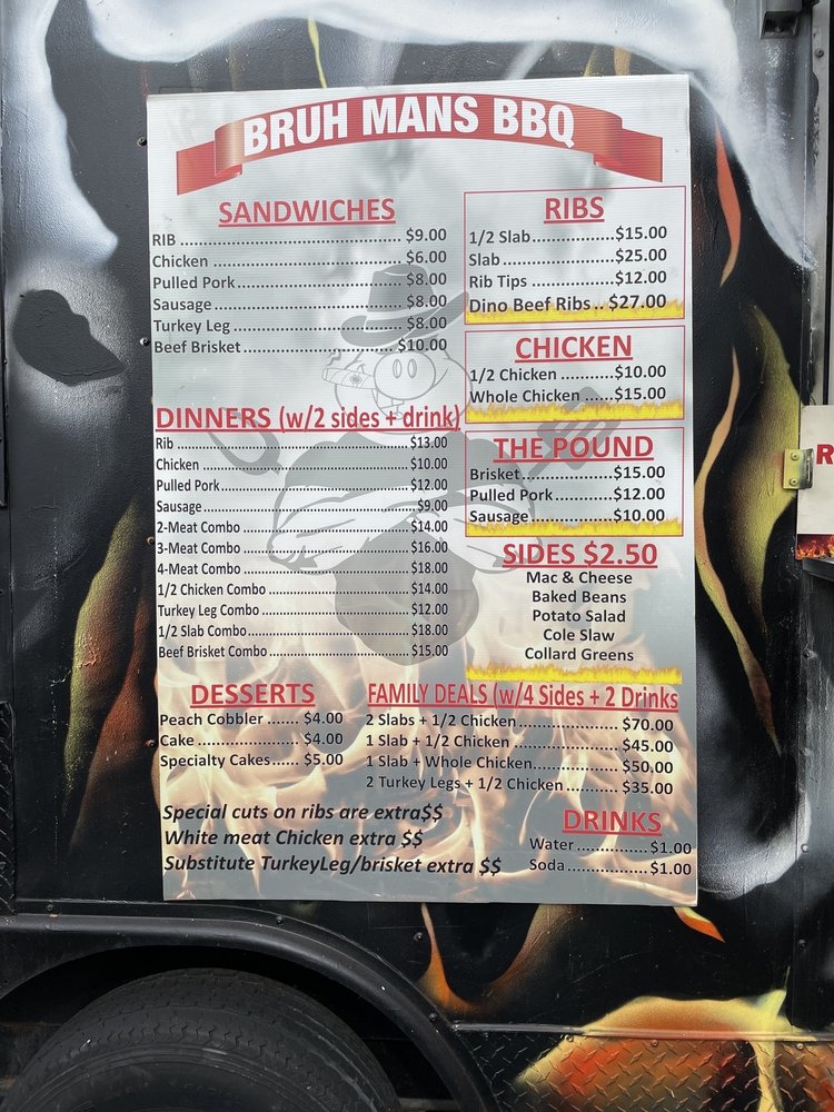 Welcome to Bruh Mans BBQ, where flavor and freshness collide in a mouthwatering explosion of BBQ goodness. Located in Tampa, FL, this food truck gem offers delivery, takeout, and even catering services. The menu boasts tender ribs, juicy chicken, and smoked sausage that will leave you craving more. The sides, from baked beans to collard greens and Mac & cheese, are a delightful complement to the main dishes. Don't miss out on the homemade peach cobbler for a sweet finish to your meal. The portions are generous, the atmosphere lively, and the service quick and friendly. With a diverse range of flavorful sauce options and happy hour specials, Bruh Mans BBQ is a top contender for the best BBQ in Tampa. Experience the best of soul food at this Black-owned establishment and savor every bite.